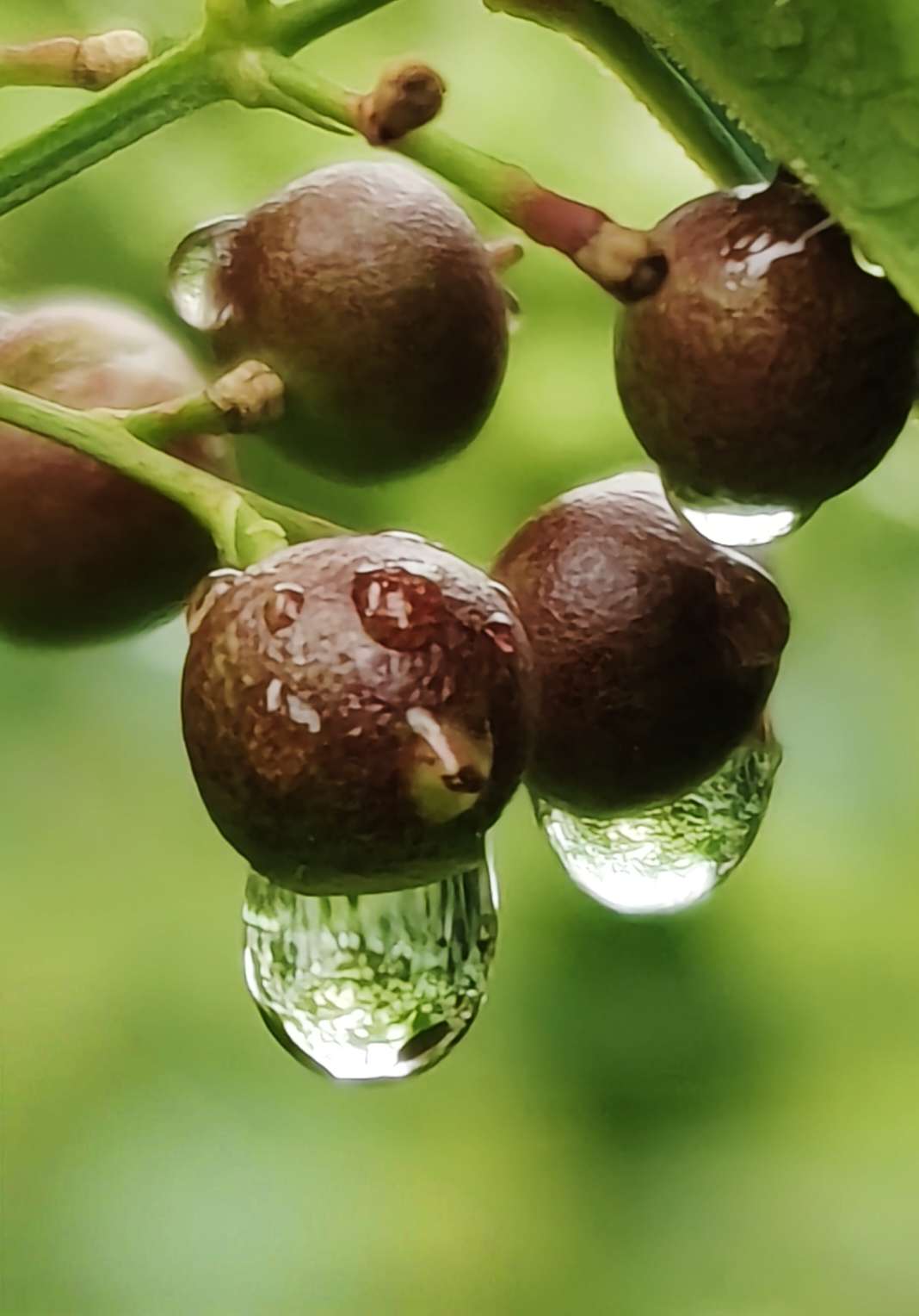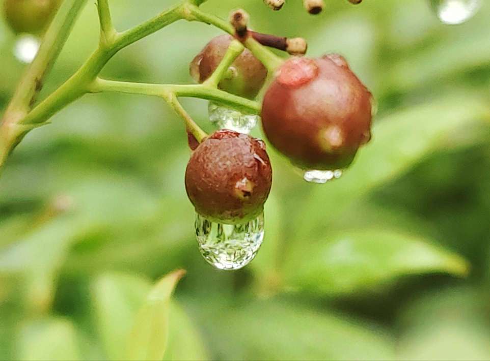 一场秋雨过后,公园里南天竹那即将成熟的橙色果实上挂满了雨滴,宛如一颗颗伤心的泪珠,既凄美又动人。(高军摄影)